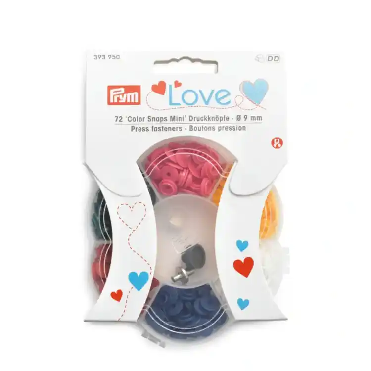 Mooi verpakt en altijd klaar voor gebruik is het bloemendoosje van Prym Love, gevuld met 72 (uiteindelijk 36 drukknopen) naaivrij drukknopen ‘Color Snaps Mini’ in 6 verschillende, vrolijke kleurstellingen.