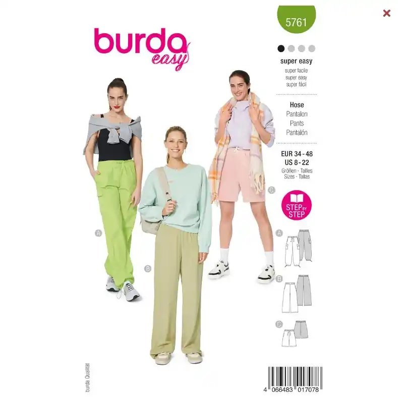 Ontdek onze beginnersvriendelijke broekpatronen! De Parachutebroek van appelgroen functioneel polyester overtuigt door zijn casual stijl en praktische details zoals een elastische tailleband en trekkoord. De elegante Marlene broek met wijde pijpen en zijzakken is perfect voor op kantoor of in de vrije tijd. En de short in trendy poederroze van zacht velours is gewoonweg schattig! Met een dubbel gestikte elastische tailleband en trekkoord voor extra comfort.