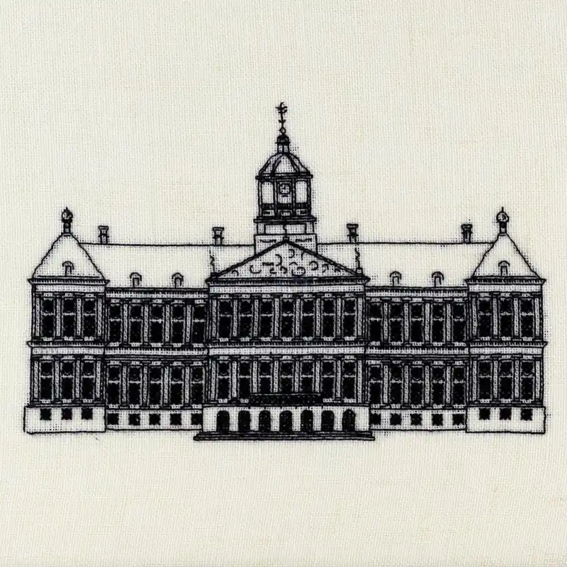 Prachtig monumentaal Koninklijk paleis op de Dam. Strakuitgevoerd in zwart-wit op linnen.